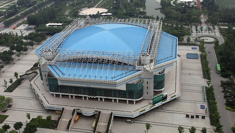 西安市體育館于1997年開始建設(shè),1999年8月竣工。它是西安體育中心的標志性建筑,先后承辦了第四屆城市運動會體操比賽和閉幕式,中國東西部經(jīng)濟合作與貿(mào)易洽談會開幕式等活動。采用寶鋼海藍PE聚酯彩涂。基板為180克/平方米的熱鍍鋅,牌號為TSt01。使用了12年后,涂層顏色依然鮮艷.