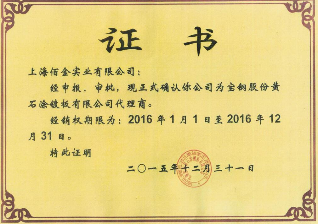 佰金華中銷售中心總公司上海佰金實業有限公司在幾年時間內,通過提供優質服務,先后獲得了與寶鋼與寶鋼黃石等大品牌合作的機會,獲取了他們的代理資格,代理證書如下: